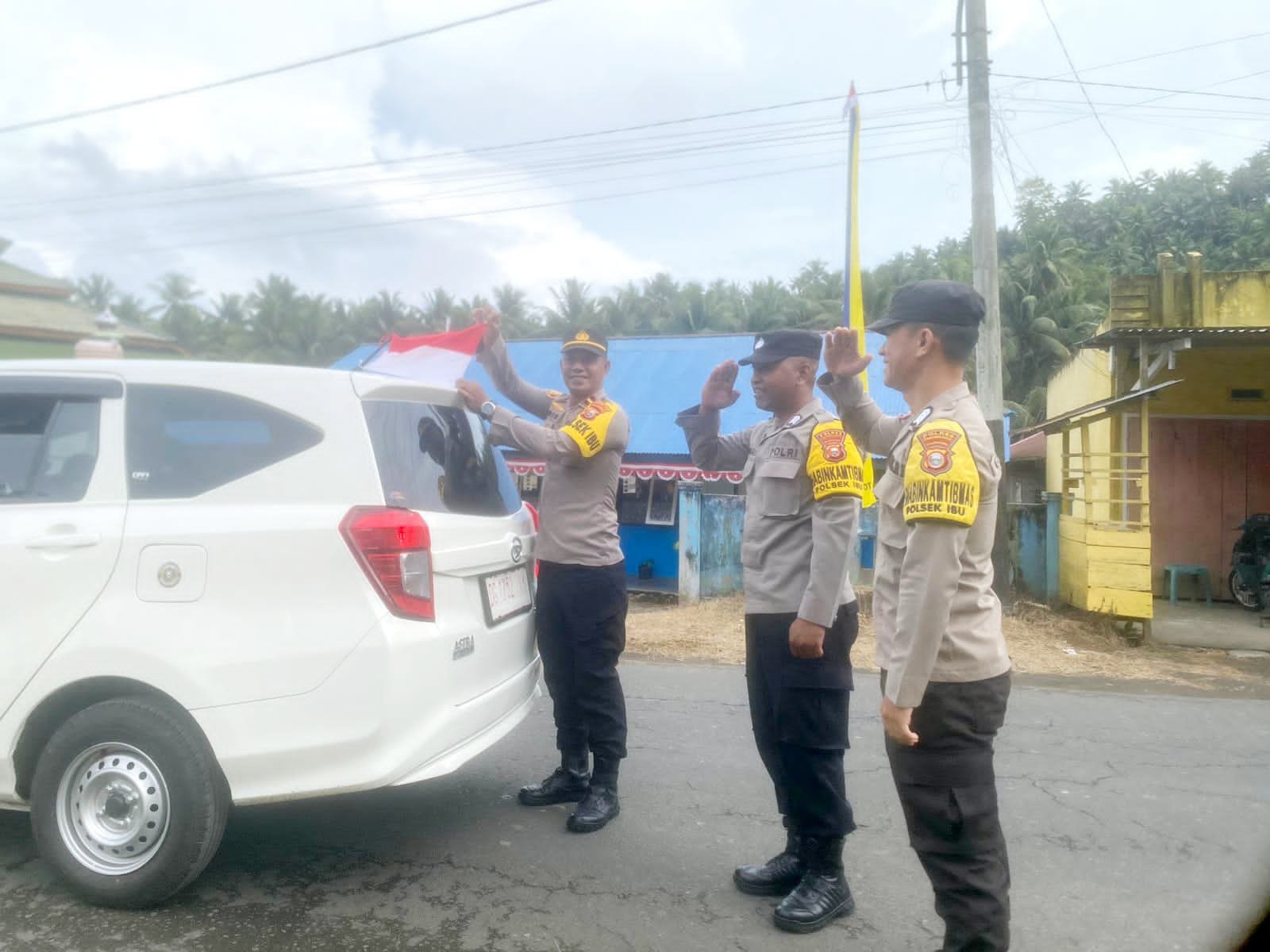 HALBAR- Kepolisian Sektor Polsek Kecamatan Ibu, Kabupaten Halmahera Barat, Provinsi Maluku Utara, membagikan bendera Merah Putih Dalam rangka menyemarakkan Hari Ulang Tahun ke-80 Kemerdekaan Republik Indonesia, senin (11/08/25)