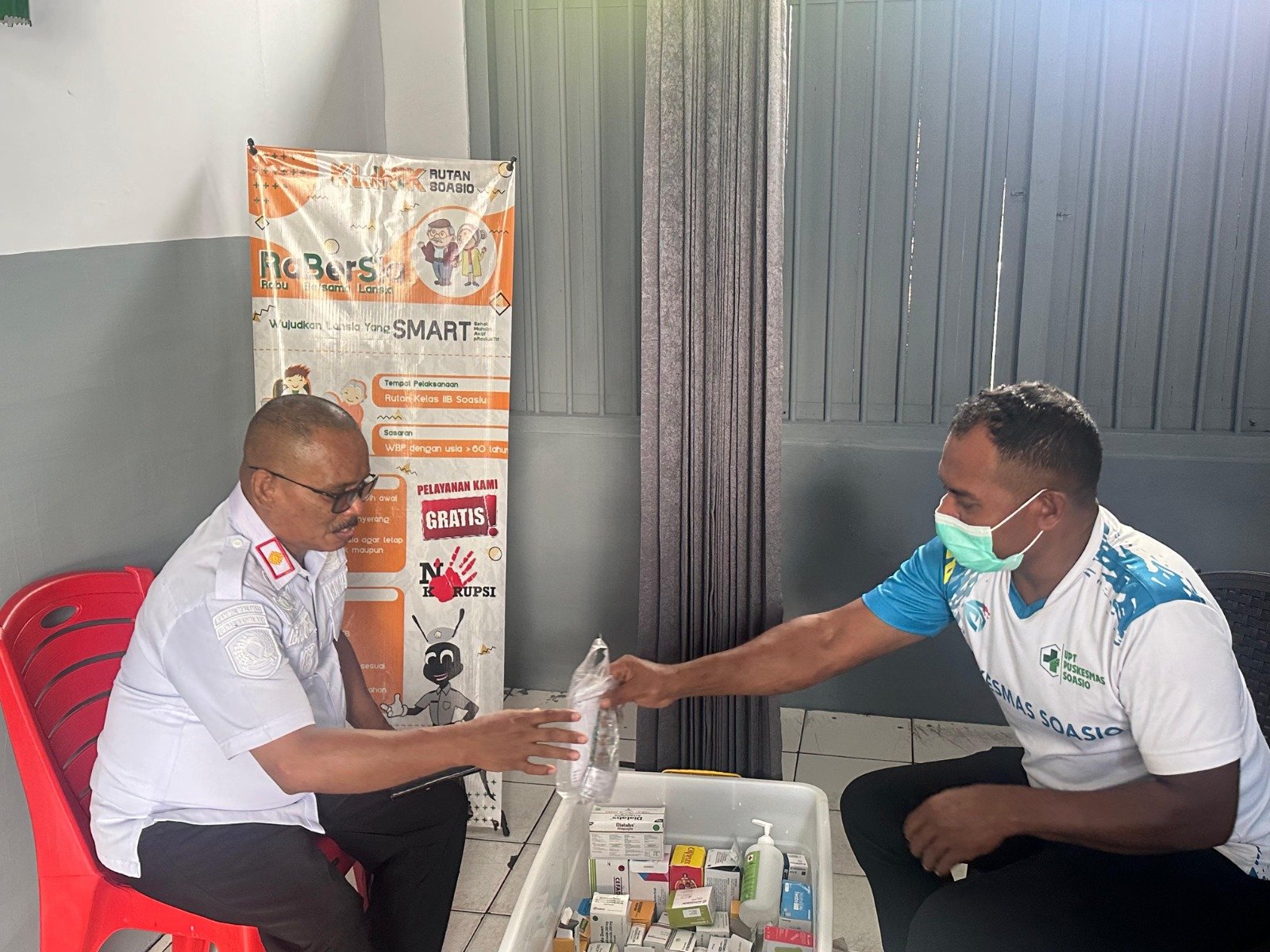 Area klinik Rutan Soasiu menjadi ruang pelayanan pemeriksaan kesehatan. Proses dimulai dengan registrasi melalui aplikasi “Satu Sehat”, yang menjadi inovasi baru dalam sistem pelayanan kesehatan. Melalui aplikasi ini, setiap peserta akan memperoleh Rapor Kesehatan Digital yang berisi hasil pemeriksaan dan data kondisi tubuh masing-masing.